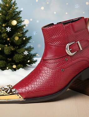 Botas masculinas vermelhas de couro sintético com estampa de cobra e bico metálico – calçados ousados e elegantes para festas de Natal e reuniões formais