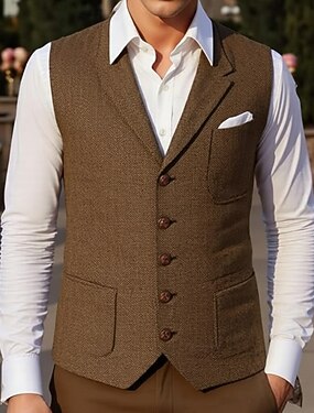 Homens Colete de tweed Colete Formal Casamento Férias Diário Moda Clássico Primavera Outono Bolsos Botões Poliéster Confortável Tecido Padrão Diagonal Não Trespassado Lapela Delgado Marron Colete