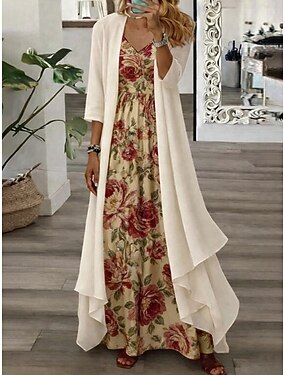 Mulheres Vestido Longo Vestido casual Conjunto de vestido Vestido de chiffon Vestido floral Elegante Moda Moderno Ao ar livre Férias Para Noite Normal Floral Manga 3/4 Decote V Cáqui Verão Primavera