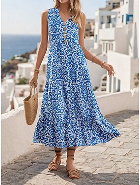 Mulheres Vestido Longo Vestido A Line Férias Casual Ao ar livre Para Noite Padrão Floral Gráfico Sem Manga Decote V Azul Amarelo Fúcsia Laranja Verão Primavera