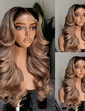 Peruca de cabelo humano virgem brasileiro não processado, ondulado, com fecho de renda 5x5 sem cola, mechas loiras com reflexos castanhos, peruca frontal de renda 13x4 com baby hair.
