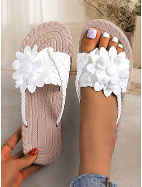 Sandálias femininas românticas brancas com estampa floral - chinelos confortáveis e rasteiros com aplique de flor grande de bolinhas, perfeitos para piscinas de hotéis de luxo e férias na praia.