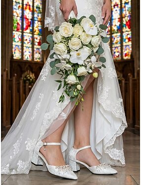Sapatos de noiva estilo Mary Jane com salto bloco na cor marfim – um modelo elegante para casamentos na igreja.