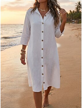 Mulheres Vestido no Joelho Linho de algodão sintético Camisetão Moda Moderno Diário Ao ar livre Férias Normal Tecido Meia Manga Colarinho de Camisa Preto Branco Verde Verão Primavera