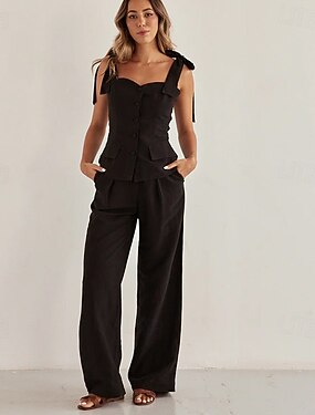 Mulheres Conjuntos de calças Linho de algodão sintético Sem Manga Com Alças Côr Sólida Cordões Laço Elegante Moda Diário Casual Diário Preto Verão Ajuste Largo