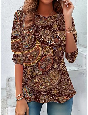 Mulheres Camiseta Imprimir Âmbar Gráfico Geométrica Vintage Moda à moda Manga Longa Gola Redonda Decote Redondo Tops regulares Diário Final de semana Marron Outono Inverno