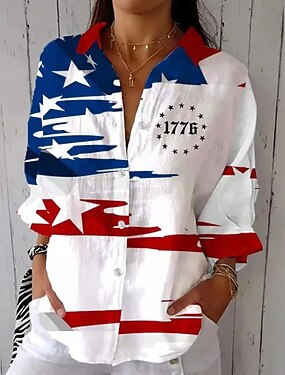 Dia da Independência Americana Mulheres Camisa Social Franzido Patchwork Botões Gráfico Bandeira Vintage à moda Manga Longa Mangas Evasê Sino Colarinho de Camisa Tops regulares Diário Trabalho Feriado