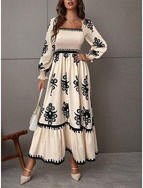 Mulheres Vestido Longo Vestido A Line Vestido floral Elegante Moda Moderno Ao ar livre Férias Festa Normal Floral Manga Longa Decote Quadrado Preto Vinho Marron Damasco Primavera Outono