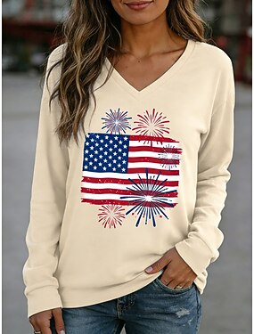Mulheres Camiseta T-shirt Imprimir Gráfico Bandeira americana Vintage à moda Clássico Manga Longa Decote V Tops regulares Diário Para Noite Final de semana Branco Vermelho Azul Marinha Cáqui Verão