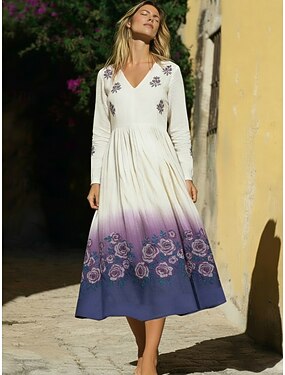 Mulheres Vestido midi Vestido Boho Vestido casual Moda Diário Ao ar livre Férias Normal Floral Manga Longa Decote V Roxo Verão Primavera Outono