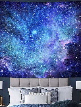 Tapeçaria de parede com nebulosa galáctica em tons de azul profundo e roxo, céu estrelado, espaço sideral, brilho etéreo, estilo cósmico, ideal para decoração de quarto, sala de estar ou dormitório.