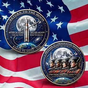 Moeda comemorativa da missão lunar Artemis II de 2026, homenagem da Terra à Lua, item colecionável de exploração espacial com astronautas e foguetes, lembrança histórica da alunissagem.