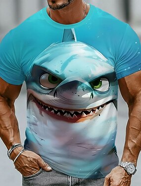 Camiseta masculina com estampa de tubarão bravo de desenho animado, sorrindo, engraçada, peculiar, predador do oceano, gola redonda, manga curta, azul claro, modelagem regular, casual, verão, praia,