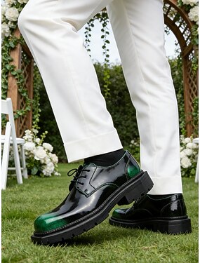 Sapatos sociais masculinos em couro sintético envernizado preto e verde, design moderno e elegante, perfeitos para festas, eventos formais e casamentos.
