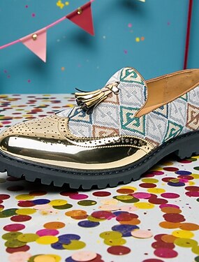 Mocassins de Franjas Metálicas Douradas de Mardi Gras Masculinos com Padrão Geométrico Colorido Design Estiloso Slip-On Perfeito para Carnaval e Celebrações Festivas