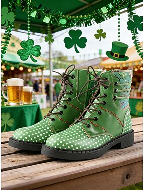 Botas femininas de cano curto com cadarço e estampa de bolinhas verdes - botas casuais de couro com estampa decorativa e zíper lateral, ideais para as festas do Dia de São Patrício, passeios no mercado, encontros casuais e tarefas do dia a dia.