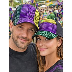 Boné unissex de poliéster com lantejoulas – chapéu para o festival de carnaval com aplicações de strass, vários padrões para uso casual e festivo.