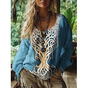 Blusa feminina gráfica vintage casual diária manga comprida decote em V tops regulares tribal árvore da vida vintage designer básico estampa férias rua saída diária estampa de feriado azul verão primavera outono