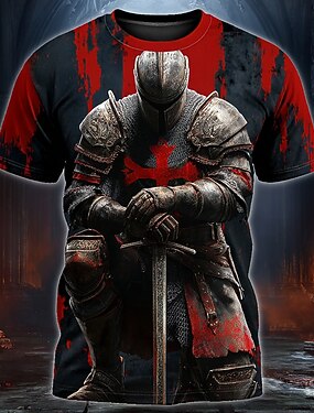 Camiseta dos Cruzados 'Cavaleiro Templário Medieval de Joelhos com Cruz Vermelha e Espada' com Efeito de Sangue Guerreiro Gótico Estampa Total Ajuste Regular Roupas Casuais de Designer
