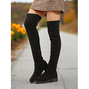 Botas femininas pretas acima do joelho – botas de inverno de camurça sintética com salto baixo para streetwear e looks casuais