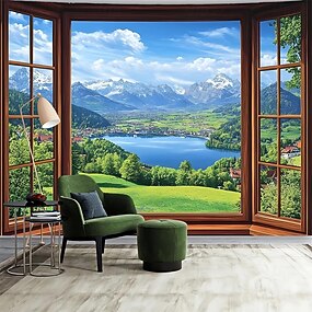 Tapeçaria de parede com vista 3D da janela, paisagem dos Alpes, montanhas nevadas, lagos e natureza, pôster grande em tecido para sala de estar, escritório, quarto e decoração de casa.