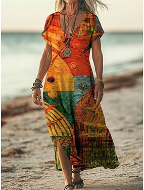 Mulheres Vestido maxi longo Vestido Boho Vestido casual Vestido A Line Vestido estampado Vintage Ao ar livre Férias Final de semana Ajuste Largo Bloco de cor Manga Curta Decote V Arco-íris Verão