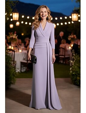 Linha A Cauda Escova Vestido formal Vestido de noite Vestido com sobressaia Vestido Para Mãe dos Noivos Manga 3/4 Decote V Colarinho de Camisa Elegante Esconder Barriga Formal Convidado do casamento