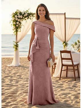 Linha A Longo Vestido formal Vestido de noite Vestido Para Mãe dos Noivos Sem Manga Assimétrico Elegante Esconder Barriga Formal Convidado do casamento Jacquard com Franzido Fru-Fru Drapeado Lateral