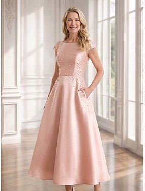 Linha A Até o Tornozelo Vestido formal Vestido Para Mãe dos Noivos Manga Curta Decote Canoa Elegante Vintage Embelezado coquetel Formal Convidado do casamento Cetim com Detalhes em Pérolas