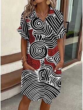 Mulheres Minivestido Camisetão Vestido casual Vestido estampado Moda Moderno Diário Praia Final de semana Normal Geométrica Manga Curta Colarinho de Camisa Preto Verão Primavera Outono