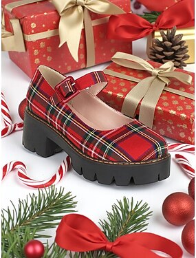 Sapatos plataforma mary jane xadrez vermelho feminino com fivela - estilo festivo de natal, perfeitos para roupas de feriado e celebrações de natal