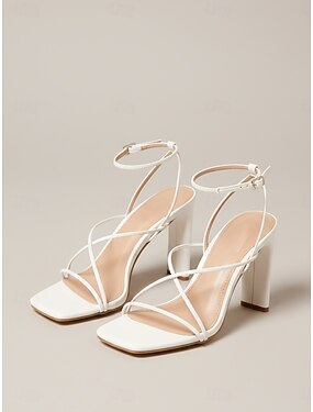 Sandálias femininas brancas de salto bloco com tiras, modelo minimalista com tira no tornozelo e salto grosso, ideais para festas de coquetel e formaturas. &eventos noturnos