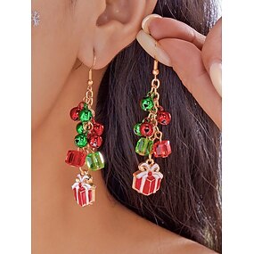 Brincos de Natal femininos em liga metálica com desenhos festivos de árvore de Natal, sinos e flocos de neve, perfeitos para festas e celebrações de fim de ano.