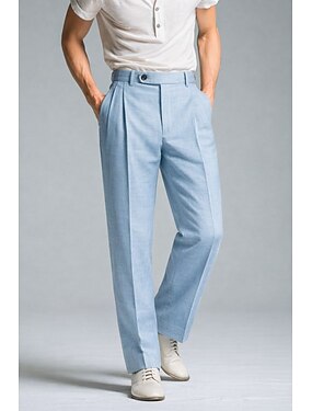 Calças sociais masculinas em algodão e linho, leves e elegantes, com corte regular, para primavera e verão.