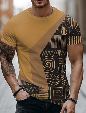 Camiseta masculina com estampa tribal em amarelo mostarda, manga curta e gola redonda, tamanhos P, M, G, GG, XGG e XXGG.