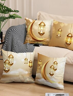 Capa de almofada decorativa para o Ramadã e Eid, lua crescente dourada &Almofada de sofá em estilo étnico com estampa de lanternas, decoração para festivais do Oriente Médio, ideal para sala de estar