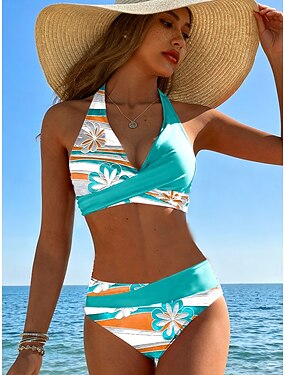 Maiô Feminino de Biquíni em 2 Peças com Estilo Cheeky Halter Vintage Sexy Gráfico Geométrico Decote Plunge Sem Mangas