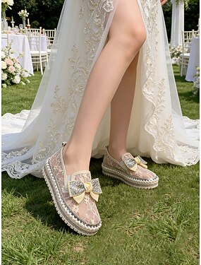 Sapatilhas plataforma femininas em renda rosa claro com detalhe de laço, sapatos românticos de noiva para jardim ao ar livre. &casamentos no gramado