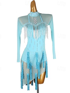 Dança Latina Vestido Pedrarias Mocassim Mulheres Espetáculo Treino Manga Longa Alto Elastano Tule
