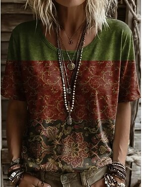 Mulheres Camiseta Imprimir Floral Gráfico Plantas Vintage à moda Casual Manga Curta Decote V Tops regulares Casual Diário Final de semana Vermelho Ferrugem Verde Escuro Azul empoeirado Verde Cinzento