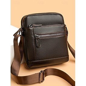 Bolsa transversal masculina em couro legítimo – preta e marrom, com vários bolsos com zíper, elegante e resistente para o trabalho e ocasiões casuais.