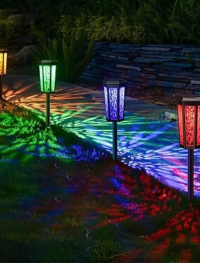 Conjunto de 4 luminárias solares de jardim com mudança de cor, à prova d'água IP65, ideais para paisagismo externo, quintal, gramado, pátio e entrada de garagem.