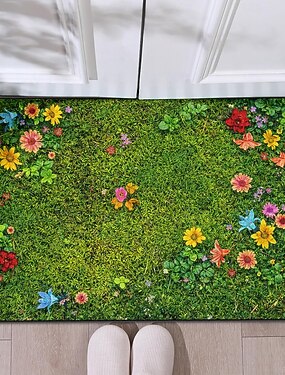 Tapete de boas-vindas para o Dia de São Patrício, com estampa de grama verde e flores vibrantes, perfeito para recepcionar visitantes na primavera.