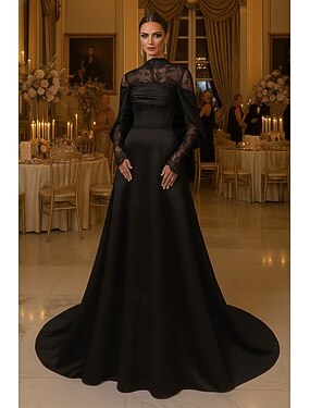 Linha A Cauda Escova Vestidos de noite Vestido de Baile Vestido formal Elegante Brilhante Sedoso Manga Longa Gola Alta Casamento Formal Bolsos Cetim com Apliques