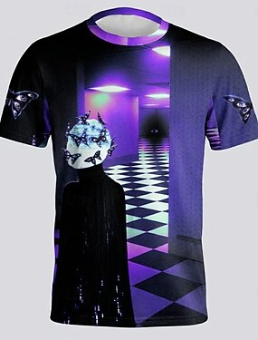 Camiseta masculina roxa brilhante com estampa de corredor xadrez, silhueta de borboleta com olhos brilhantes, estilo dreamcore, weirdcore, espaço liminar, estética surreal, casual, streetwear, rave,