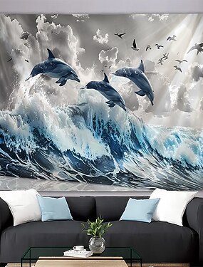 Tapeçaria de golfinho com ondas do oceano saltando, arte de parede com golfinho à luz do sol, espuma do mar, natureza e vida selvagem para decoração de sala de ioga e espaço de meditação.