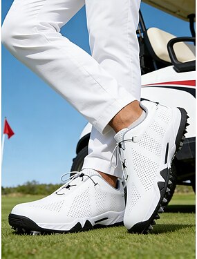 Sapatos de golfe masculinos brancos, em malha respirável, leves e confortáveis, com sola antiderrapante, perfeitos para o campo de golfe e esportes ao ar livre.
