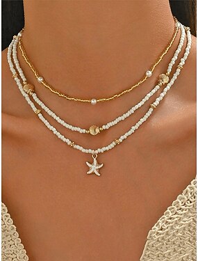 Colar feminino boêmio com pingente de estrela-do-mar em liga metálica, conjunto de 3 camadas, joia para férias na praia, ideal para meninas e mulheres, colar gargantilha com contas em camadas para