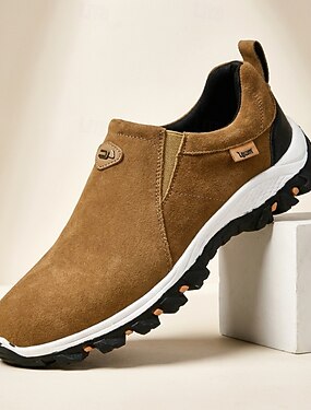 Sapatos casuais masculinos marrons, estilo slip-on, com toque de camurça, leves e confortáveis para uso diário, viagens, deslocamentos, looks de fim de semana, lazer ao ar livre e estilo esportivo casual.