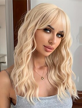 peruca loira platina para mulheres peruca em camadas com franja peruca na altura dos ombros de 22 polegadas peruca de cabelo sintético de aparência natural para uso diário em festas